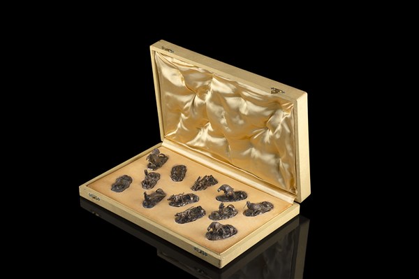 Gruppo di dodici segnaposto in argento dorato raffiguranti animali a tutto tond