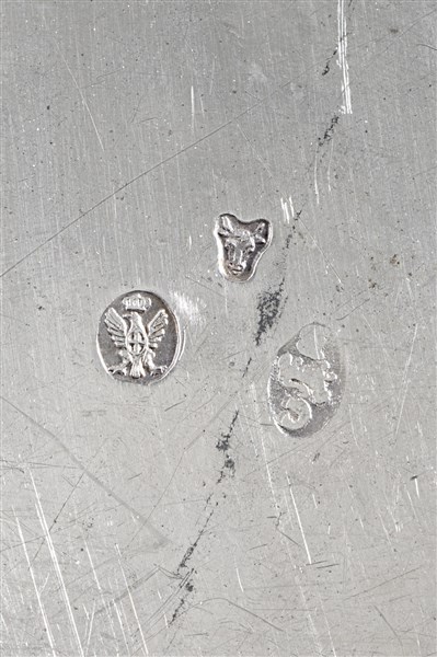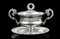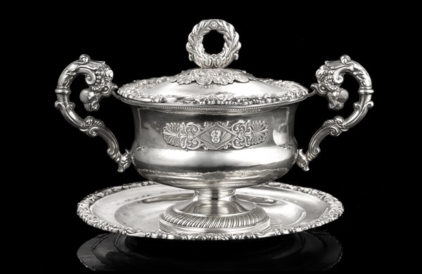 Zuccheriera biansata con piattino in argento. Bordi decorati a volute fogliate, anse con cornucopie con frutti e foglie, fascia a testa di cherubino. Torino, secolo XIX (h. cm 12) (g 600 ca.)