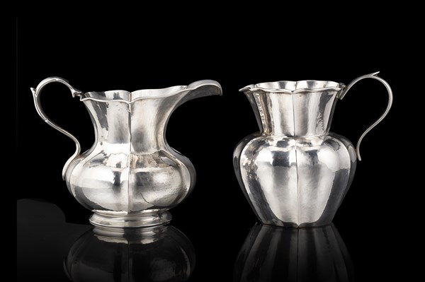 Lotto composto da due brocche in argento martellato e costolato. Titolo 800 (h.