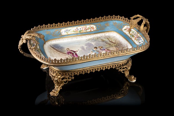 Manifattura di Sèvres, secolo XIX. Alzata biansata in porcellana e metallo decorata in policromia a scena galante e motivi floreali entro cartelle dorate su fondo azzurro (cm 47x18x23) Etichetta cartacea di provenienza: G. Guastalla & Co., Milano