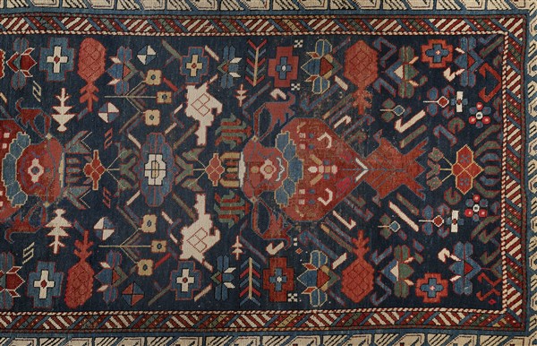 Decoro con vasi stilizzati rossi, rami fioriti policromi su fondo blu notte. Bordura con motivo "cane che corre" azzurro su fondo bianco. (cm 215x132) (difetti, rapature e vecchi restauri)