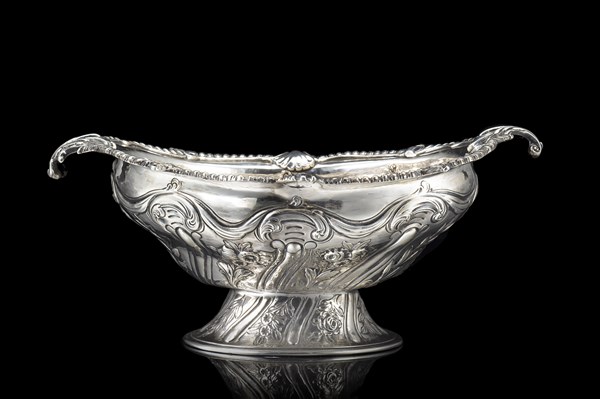 Alzata biansata in argento con bordo sagomato decorato a foglie e volute. Corpo e piede sbalzati a fregi, rami fioriti e fiori. Londra, 1825. Argentiere William Barret II? (cm 30x13x21) (g 980 ca.)