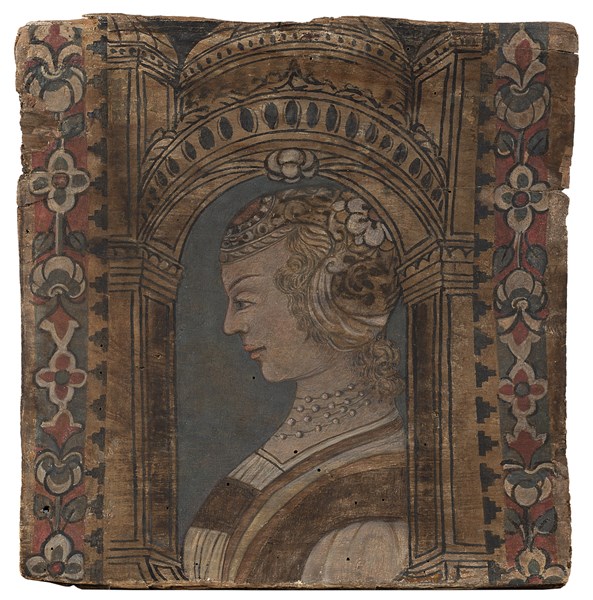 Scuola cremonese del secolo XVI Profilo di dama Tavoletta da soffitto dipinta