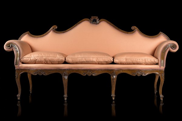 Divano in noce con schienale sagomato decorato al centro da conchiglia, braccioli estroflessi, fascia e gambe mosse ed intagliate a motivi floreali e conchiglie. Lombardia, secolo XVIII (l. cm 227) (mancanze e restauri)