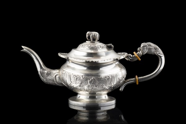 Teiera in argento decorata sul corpo con scena di caccia alle fiere, anse e beccuccio zoomorfo, presa in forma di elefante a tutto tondo. India, secolo XX (h. cm 14) (g lordi 660 ca.) (lievi difetti)