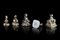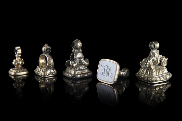 Gruppo di cinque sigilli a pendente in oro basso, alcuni con pietre dure incise a cifre. Secolo XIX