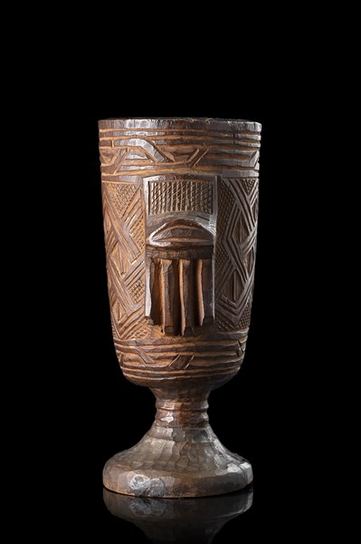 Calice intagliato con motivi a tutto tondo si linee geometriche che si intersecano tra di loro. Arte tipica del Regno Kuba.