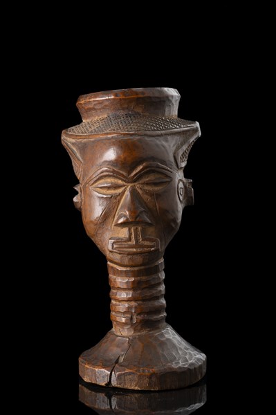 Coppa scolpita a tutto tondo con figura antropomorfa arricchita da un'acconciatura particolare. Arte tipica del Regno Kuba.