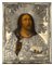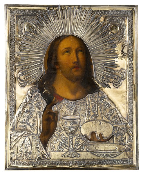 Icona ad olio su tavola raffigurante Cristo benedicente, riza in vermeille sbalzato e inciso. Punzoni di San Pietroburgo, argentiere non identificato (cm 25x20) (difetti)