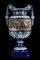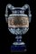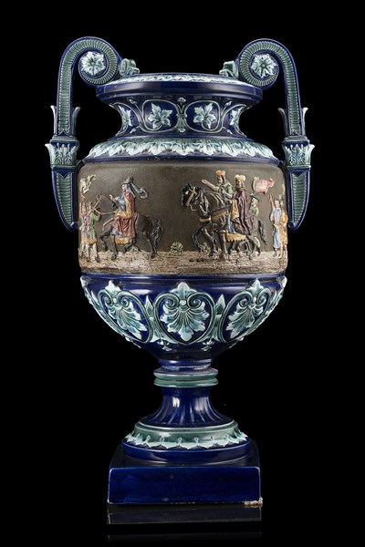 Manifattura francese o inglese, secolo XIX.Vaso biansato in ceramica di forma classica. Fascia centrale decorata in policromia con corteo di figure di regnanti e dignitari a cavallo. Corpo smaltato nei toni del blu e decorato in rilievo a foglie d'acanto e motivi stilizzati. Marca e numerale 8966 incusso alla base (h. cm 50) (lievi difetti)