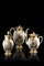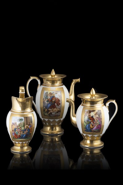 Manifattura francese, secolo XIX. Servizio da tè e caffè in porcellana dipinta in policromia a scene bibliche in cornici dorate a foglie ed elementi vegetali (h. max cm 24) (lievi difetti)