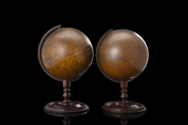 Newton & Son, Londra, 1860. Globo terrestre e globo celeste con fusi delineati e colorati. Supporti in legno tornito, meridiane graduate in ottone (h. max cm 37,5) (restauri)