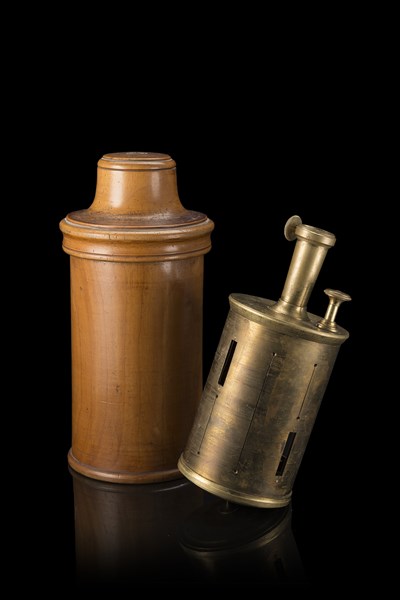 Squadro agrimensorio graduato in ottone di forma cilindrica nel suo contenitore di legno