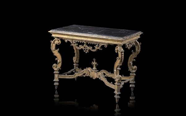 Consolle in legno intagliato e dorato con fascia incisa a motivi geometrici e volute. Grembiale e gambe sagomate e scolpite a riccioli. Traverse terminanti a pinnacolo. Piano in marmo non pertinente. Secolo XVIII (cm 120x89x64) (difetti)