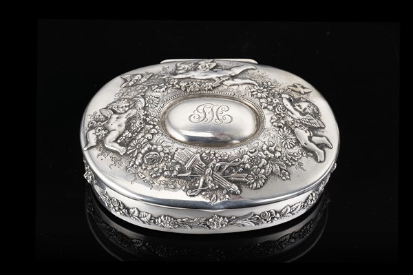 Scatola in argento con interno in vermeille, coperchio cifrato decorato da amor