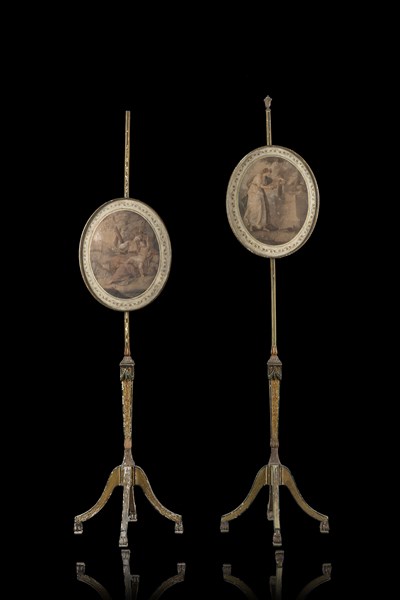 Coppia di ventole in legno intagliato e laccato a festoni e motivi vegetali. Pagine ovali contenenti incisioni acquerellate da Angelica Kaufmann. Piedi sagomati. Secolo XIX (h. tot cm 160) (difetti e mancanze)