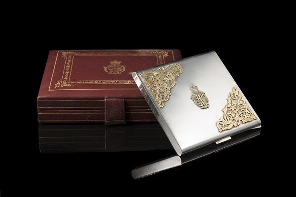 Portasigarette in argento con coperchio decorato con fregio in oro e con monogramma dell'Imperatore etiope Hailé Selassié. In custodia in pelle impressa in oro a fregi e monogramma imperiale (cm 10x10) (g 180 ca.)