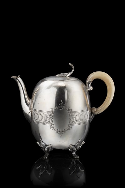 Teiera di forma bombata in argento con corpo liscio inciso a motivo concatenato, presa del coperchio a foglia a tutto tondo, ansa in avorio. Poggiante su quattro piedini decorati a foglia. Punzoni francesi, inizio secolo XX. Argentiere F.D. (h. cm 18) (g lordi 750 ca.) (lievi difetti)