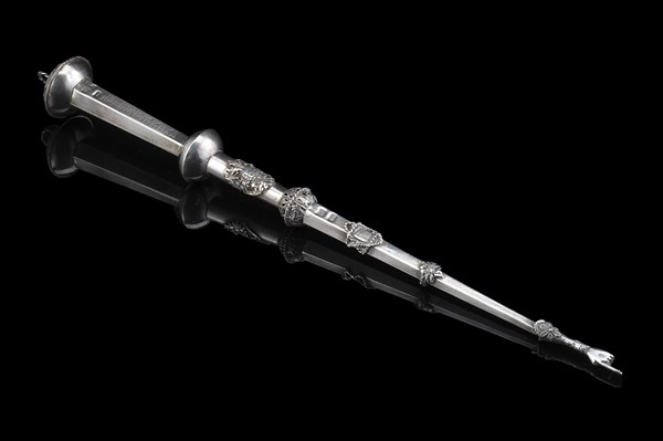 A silver yad with inscription in Hebrew. Spurious marks of St. Petersburg, 1867 (l. cm 39) (g 95 ca.)