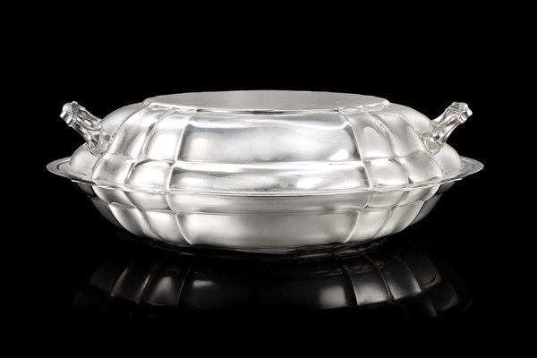 Scaldavivande in argento di forma mossa con anse decorate a riccioli. Punzoni di Birmingham, 1946. Argentiere Gorham, modello Chippendale (l. cm 27) (g 880 ca.)