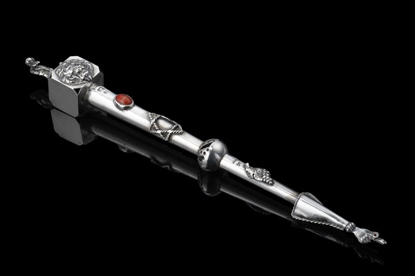 Yad in argento con decoro a stella di David, stemma, pietra rossa cabochon e piccolo rubino. Presa sormontata da volatile a tutto tondo (l. cm 27) (g lordi 70 ca.)