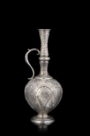 Bottiglia in argento sbalzata incisa e cesellata a decori naturalistici e figure in abiti russi. Ansa a volta. Reca marchi di Mosca della fine del secolo XIX (h. cm 30) (g 420 ca.) (lievi difetti)