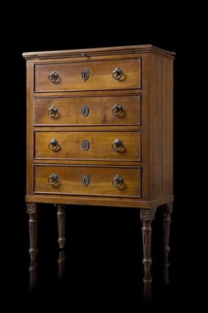 Antico mobiletto in ciliegio a quattro cassetti, gambe scanalate e intagliate (