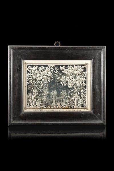 Professor Moscarelli, Sicilia, secolo XIX. Diorama in carta traforata a diversi livelli, sfondo dipinto a paesaggio. Inscritto "fatto colle forbici dal Prof. ss. re Moscarelli. Giardino da cui si vede in lontananza Sciglio ed i celebri scogli di Scilla" In cornice in legno ebanizzato (cm 32x26x7) (difetti)