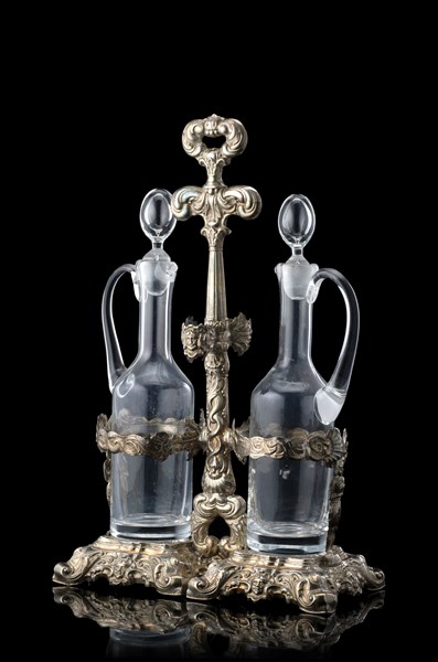 Cruet in lamina d'argento sbalzata a volute, motivi vegetali e mascheroni, ampolle in vetro. Secolo XIX (g 250 ca.)
