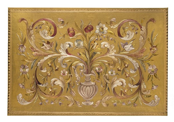 Pannello in seta color giallo oro ricamato in seta policroma. Decoro raffigurante al centro un versatoio baccellato ricolmo di rami fioriti, melograni, volute a foglie d'acanto. Italia, metà secolo XX. (cm 170x112) (lievi difetti)