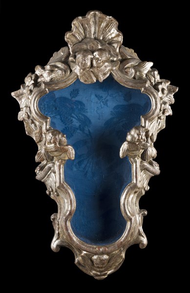 Teca in legno intagliato e argentato di forma mossa con girali di foglie e fiori tra cherubini, cimasa centrata da conchiglia. Secolo XVIII (cm 47x75x12) (difetti)