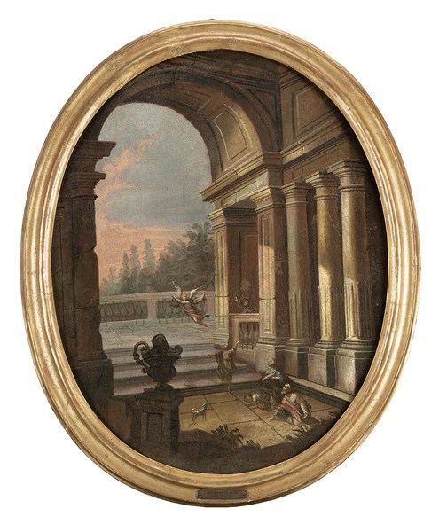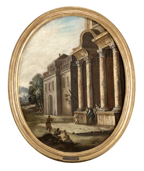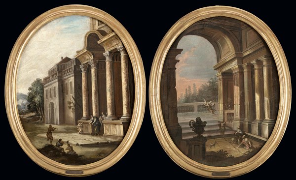 Veduta architettonica con ritorno del figliol prodigo; Veduta architettonica con annuncio ai pastori