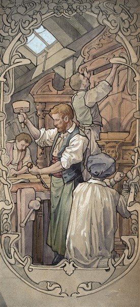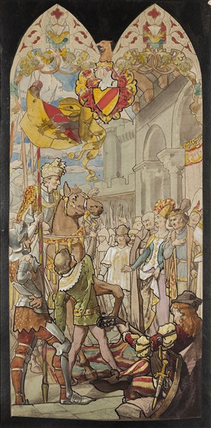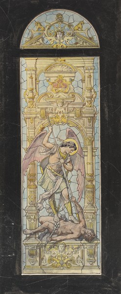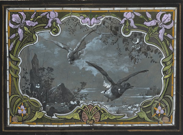 Lot composed of five drawings in pen and watercolors, of which four are studies for stained glass and one depicting "Ducks in flight" (circa cm. 17x8; 27x8; 24x12; 27x16,5; 13,5x18,5). One initialed at the bottom "CA". In passepartout (defects)