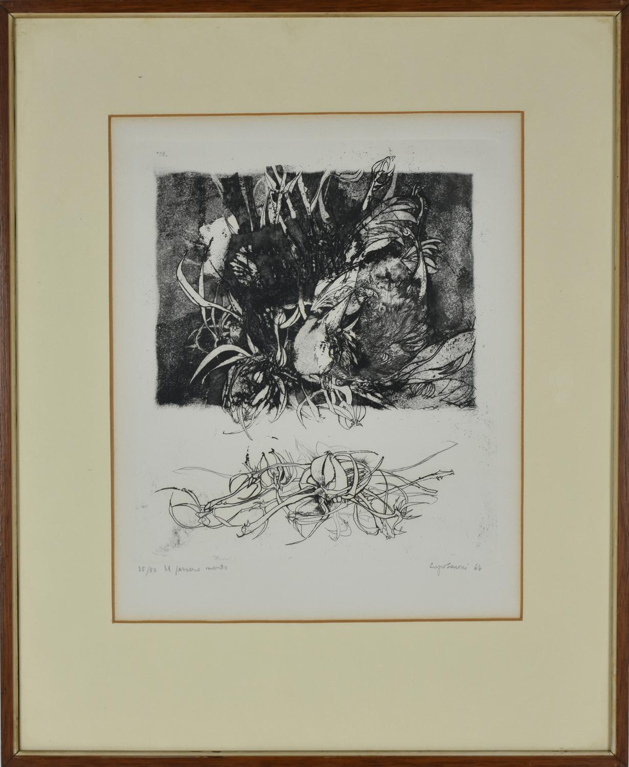 Sergio Saroni IL PASSERO MORTO acquaforte su carta, cm 54x44 (lastra cm...