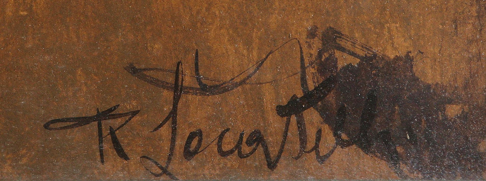 LOCATELLI ROMUALDO (1905 - 1943) Uomoni del deserto. Olio su cartone pressato. Cm 50x100. Firma in basso a destra. Opera provvista di permesso di esportazione - export llicence provided Cornice presente.