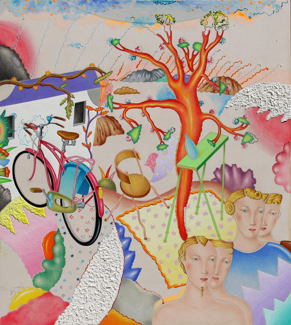 ALINARI Luca, Ultimo viaggio ipnotico tecnica mista su tela applicata su tavola cm. 90 x 80Firma "Alinari" (in basso a sinistra)