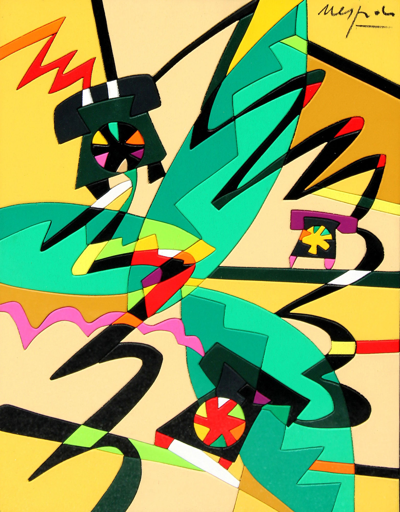 NESPOLO Ugo, Telephone excursus 1989 acrilico su legno intarsiato cm. 40 x 30Firma "Nespolo" (in alto a destra). Autentica dell'artista su fotografia