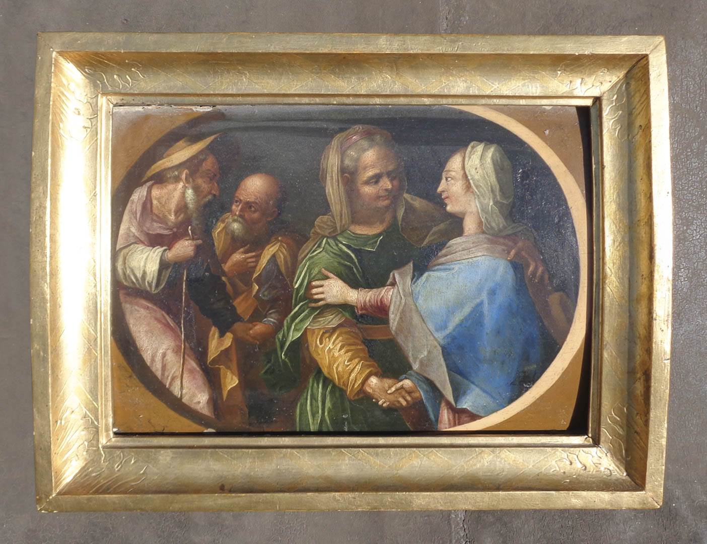 Martin Theophil Polak zugeschrieben/attribuito (Polen/Polonia um/ca. 1570 – Brixen/Bressanone 1639) Visitazione;Olio su tavola, 30 x 42 cm, tavola fortemente piegata