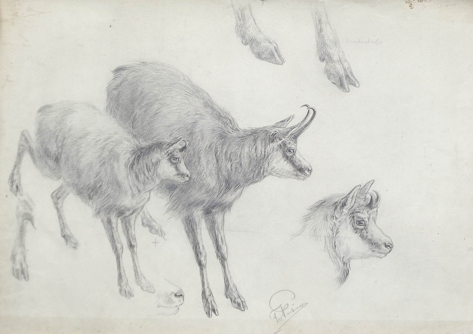 Franz Xaver von Pausinger (Salzburg/Salisburgo 1839 – 1915) Studio di Camosci;Matita, carboncino, 39,8 x 55 cm, tagli ai bordi, sgualciti