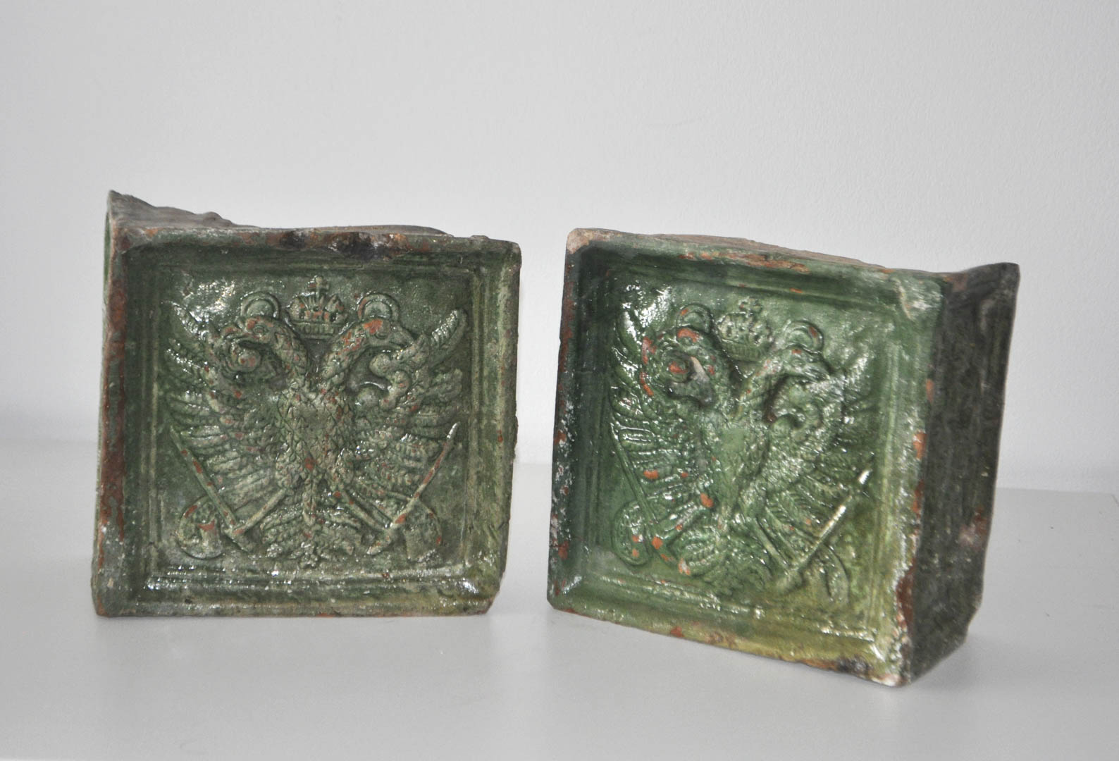 2 maioliche per stufa con aquila bicipite, seconda metà del XIX sec.;19 x 19 cm, danni