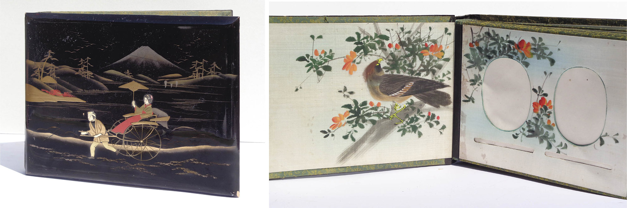 Fotoalbum Giapponese, Inizio ‘900;Con 10 pagine portafotografia in cartoncino e rivestite in seta acquerellata a motivi