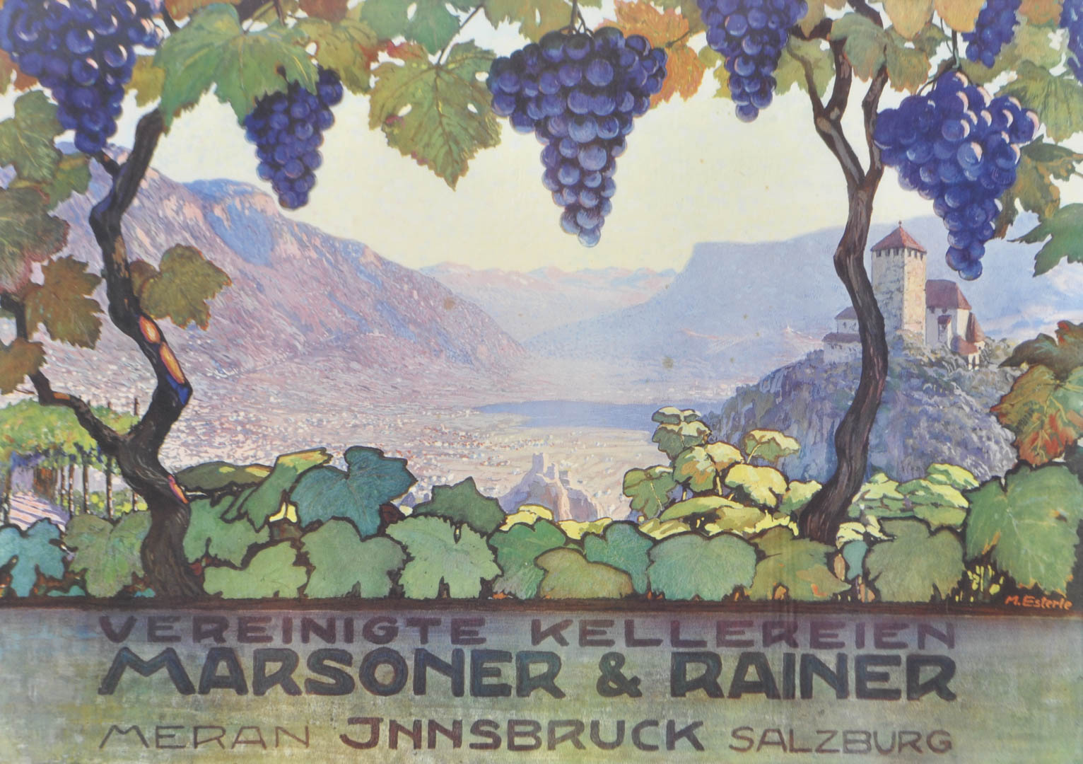Max von Esterle (Cortina 1870 – Bezau/Voralberg 1947) Manifesto “Vereinigte Kellereien Marsoner & Rainer Meran Innsbruck, 1920;Litografia a colori, 49 x 69 cm, in cornice