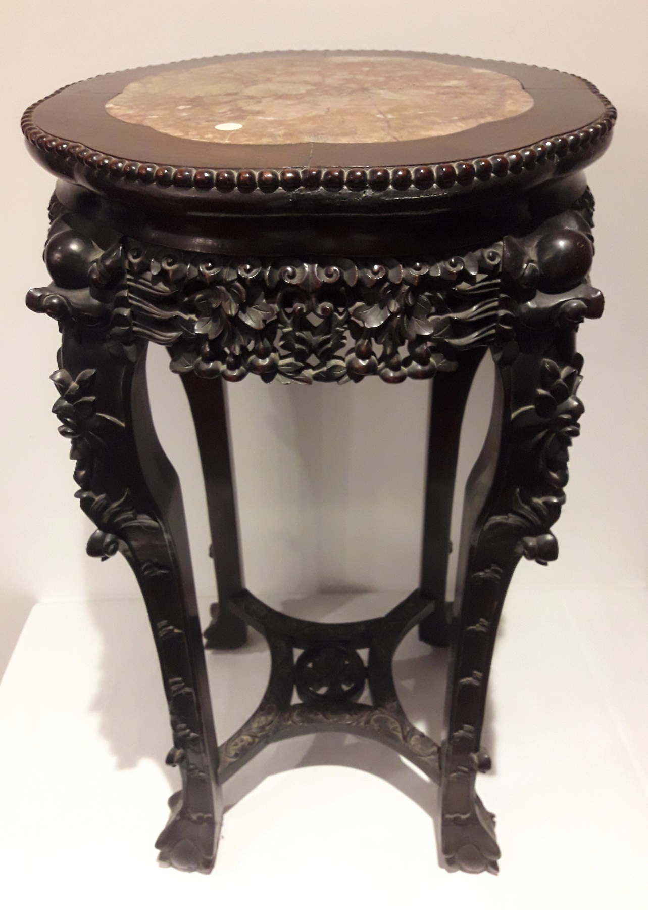 Made of rosewood, finely decorated, perforated and carved. On the floor is inserted to intarsio shaped marble. Size 80x43x53 in diameter.
