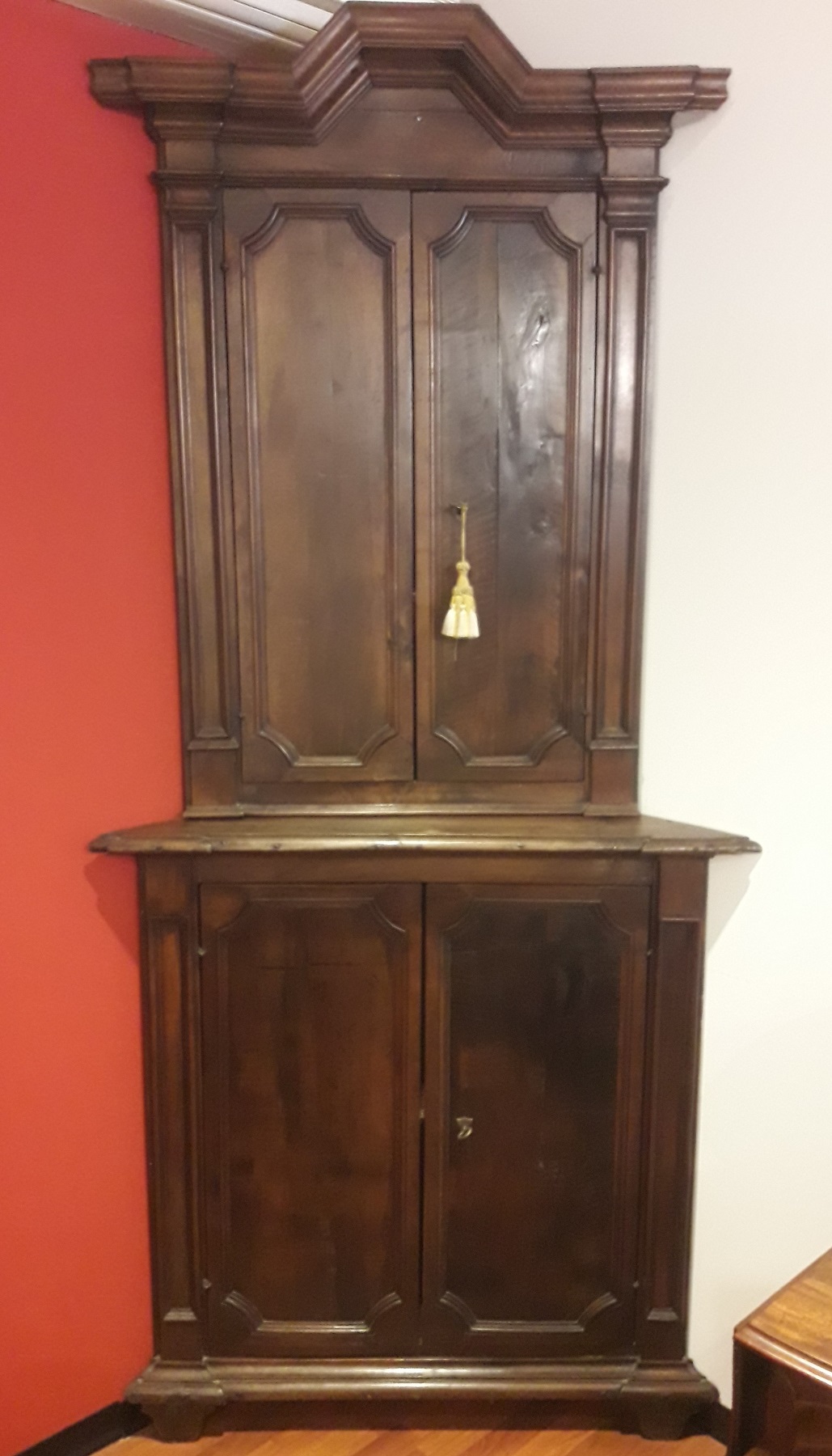 ANGOLIERA realizzata in noce. Stile italiano, risalente alla seconda meta’del 700. L’angoliera e’ composta da 4 ante più 3 ripiani. Dimensioni cm 111x240 diagonale, cm 80 lato.