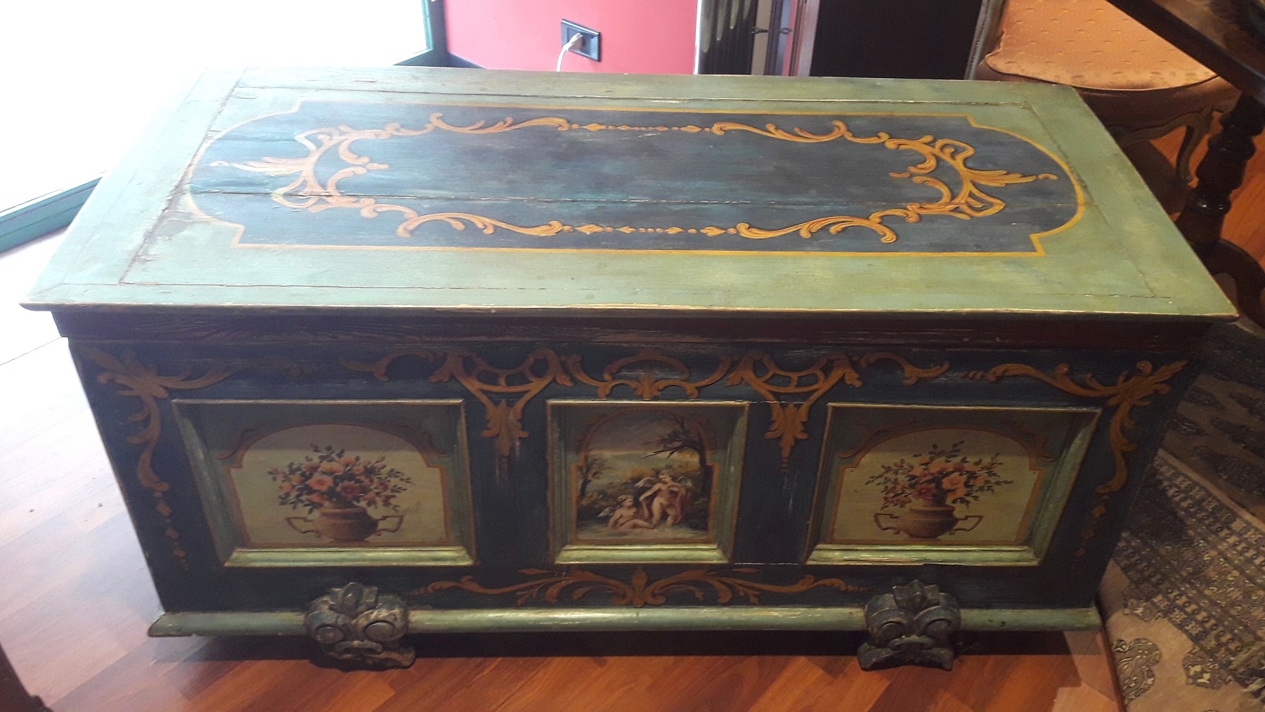CASSAPANCA TIROLESE realizzata in pino, finemente decorata, risalente alla seconda metà del 700. Piccoli restauri facoltativi. Dimensioni cm 59x137x67 H.