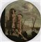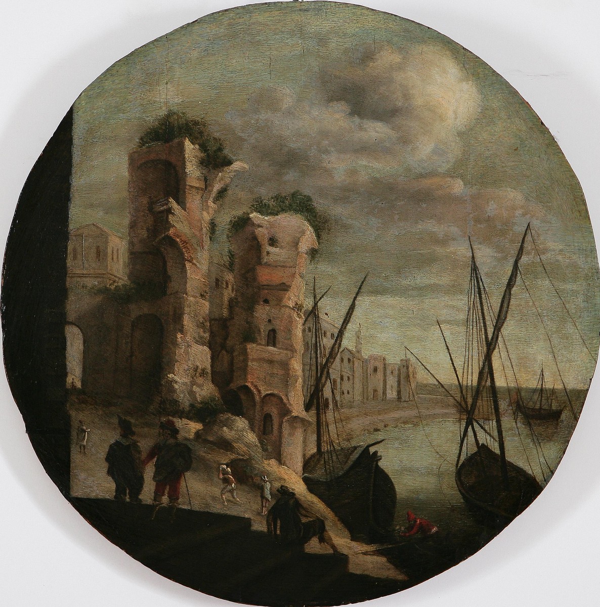 PITTORE NORDICO ATTIVO IN ITALIA NEL XVII SECOLO Porto immaginario con imbarcazioni. Olio su tavola. diamentro cm 51