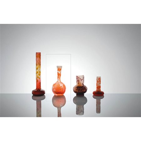 GALLE' - Piccolo vaso soliflore in vetro con decorazione a cammeo nei toni dell’arancio a guisa di foglie e fiori.