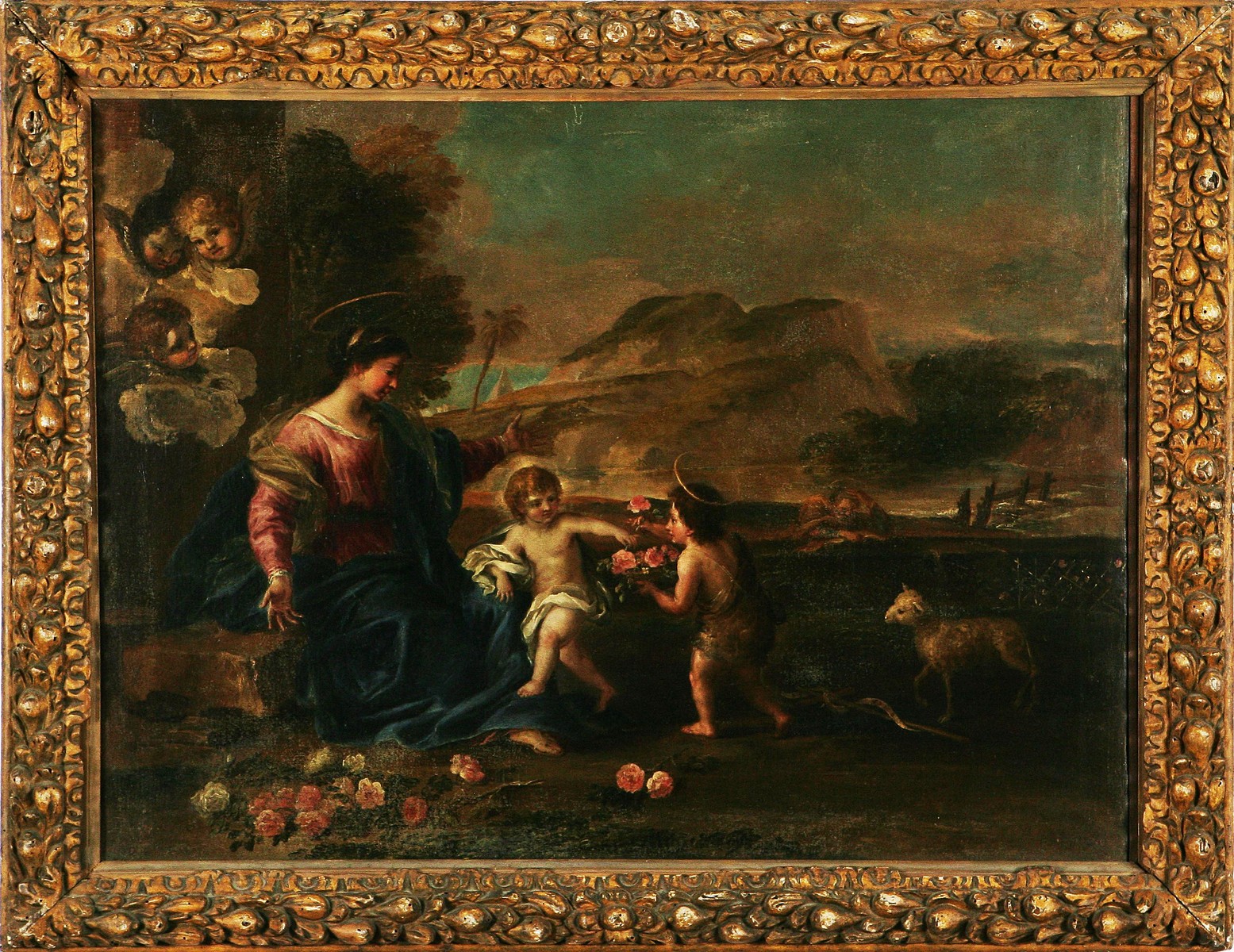 Attribuito a - GAULLI GIOVANNI BATTISTA (1639 - 1709) Madonna con Bambino e San Giovannino che porge rose, Olio su tavola. Cm 59x74. Opera provvista di certificato di esportazione - Export licence provided.