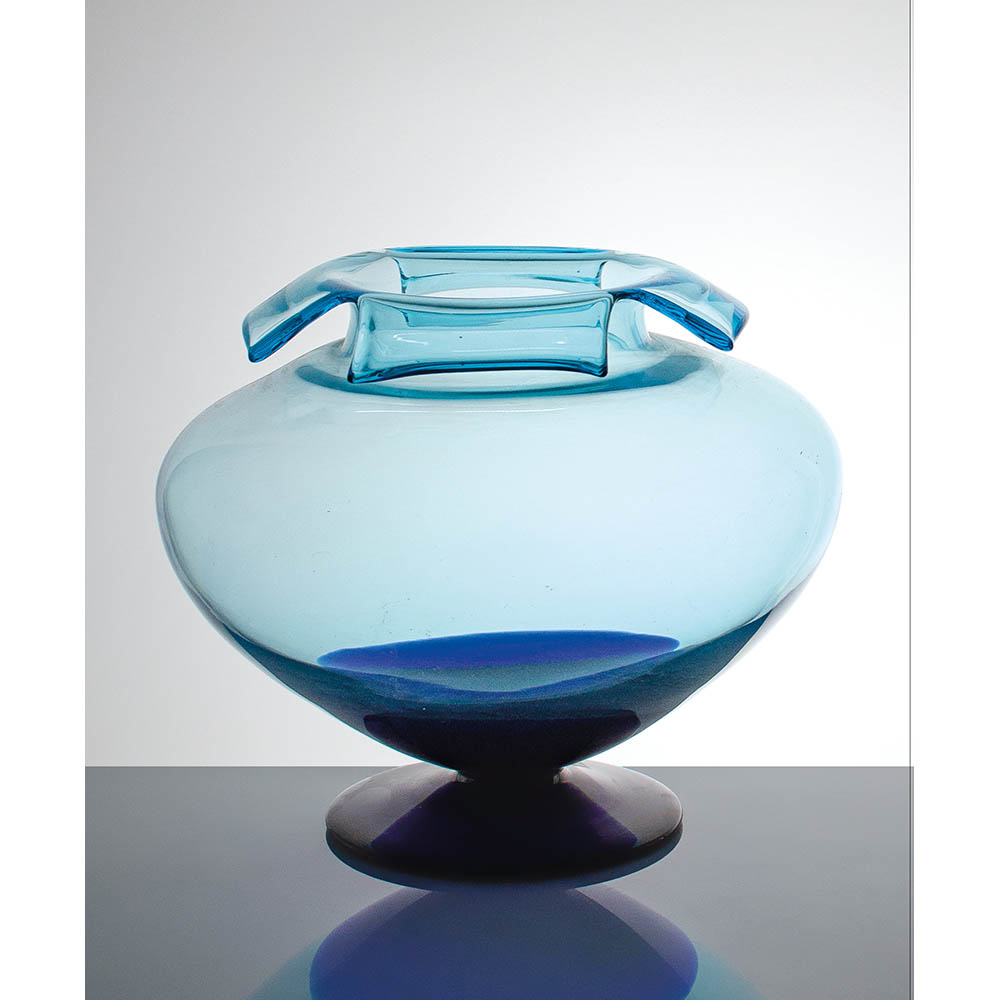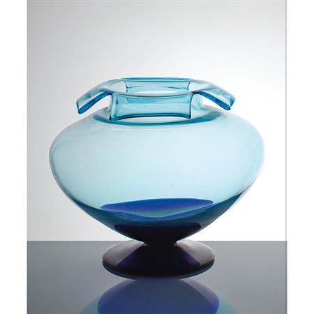CARLO MORETTI - Vaso in vetro nei toni del blu con corpo globulare montato su piede circolare e orlo frastagliato, anni ‘80.