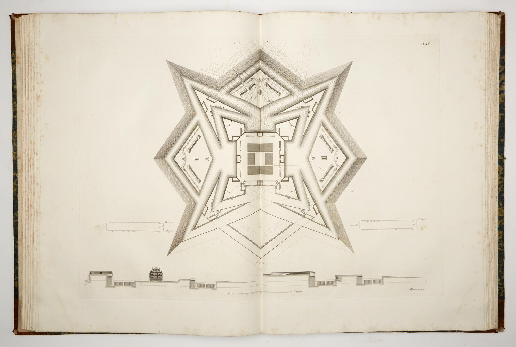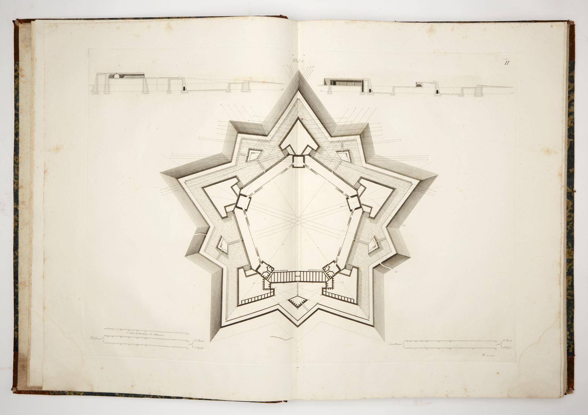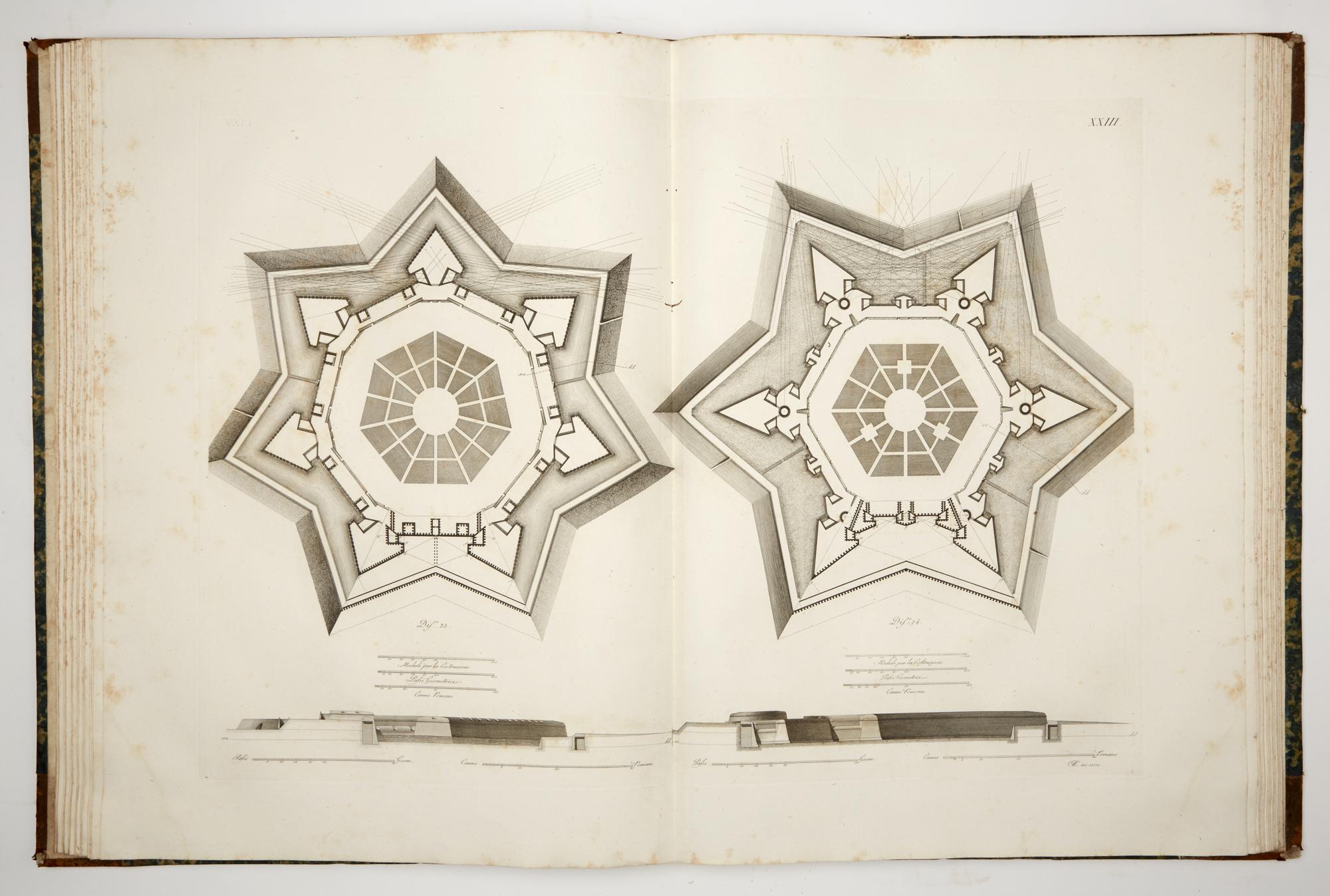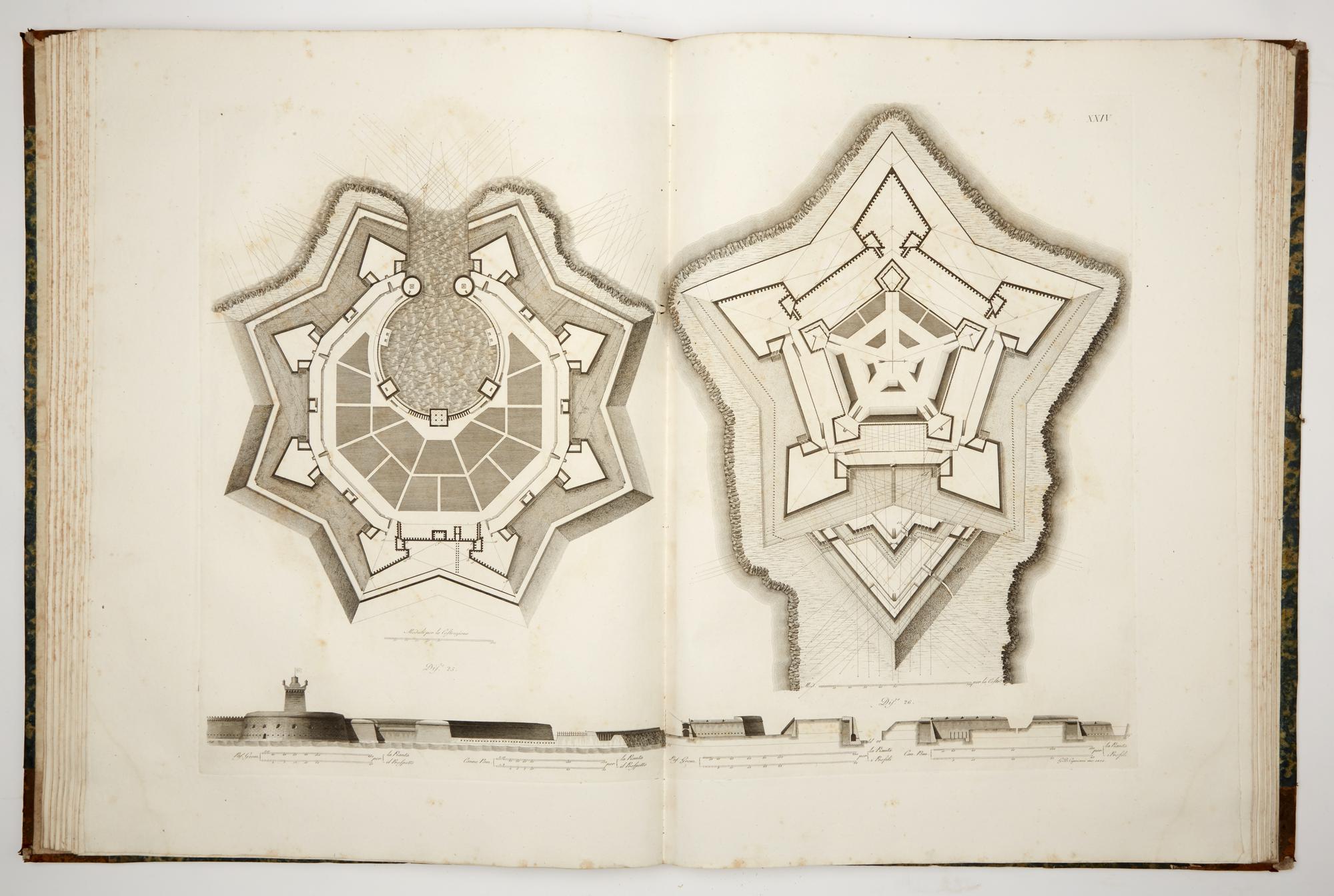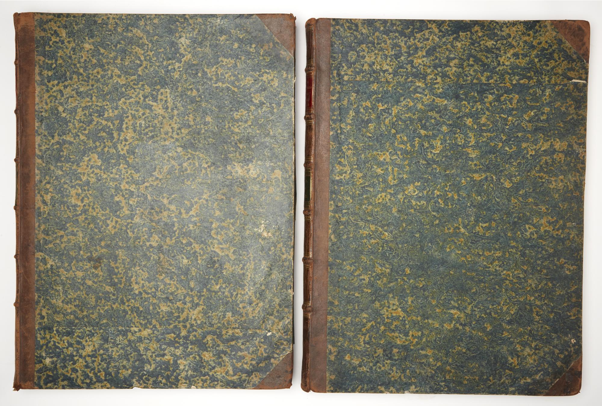 2 volumes in grand folio, 778 x 540 mm. The first 3 volumes of text are missing. The volumes on sale are the last 2 volumes of the publication containing the engraved copper plates with an extended format of 778x1080 mm. In volume IV, numbered plates I-XLIX, in volume V numbered plates L-CIV. They are all engraved by Pietro Ruga and Giovanni Battista Cipriani, with dates varying from 1805 to 1809. Binding in half leather and sponged calfskin, with defects and shortcomings in the spines and boards. Lot not liable to be returned. One year after the death of De Marchi (1575), a Francesco Marchi 'Architettura Militare' was printed in Venice from the typography of Francesco Franceschi (all commentators agree in defining it without date or place). Subsequent reprints were made throughout the seventeenth and eighteenth centuries. also circulating under different authorship; testifying a growing fortune in the late eighteenth century, and to remedy an alleged shortage of copies, in 1810 the architect L. Marini edited the present reprint of the treatise, in five volumes in real folio with a giant format, which were naturally dedicated "to the Majesty of Napoleon I".